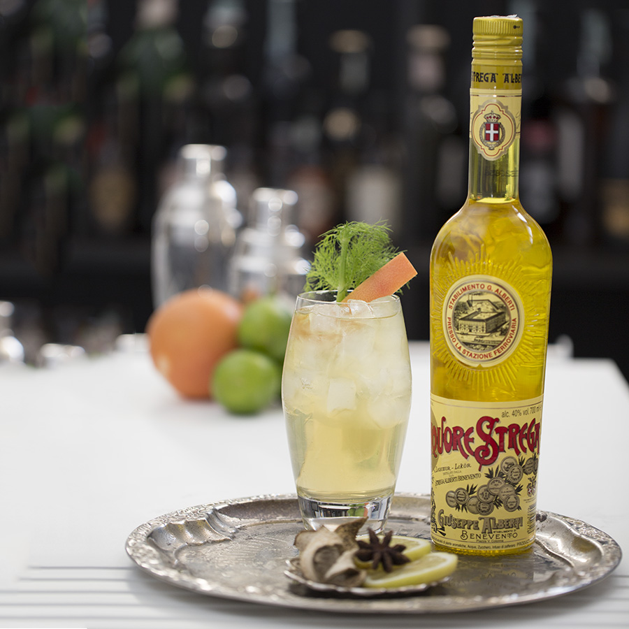 Ingredienti: 4,5cl Liquore Strega 2 cl Vermut Dry 3 cl Succo di Pompelmo rosa 2 cl Sciroppo di finocchio Soda